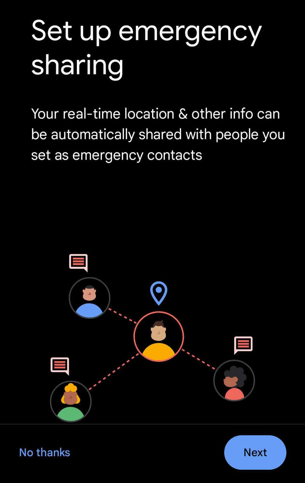 - First, you can set up emergency real-time location sharing. This is a relatively new feature. Select Next to set emergency contacts or No thanks to skip to the next section.