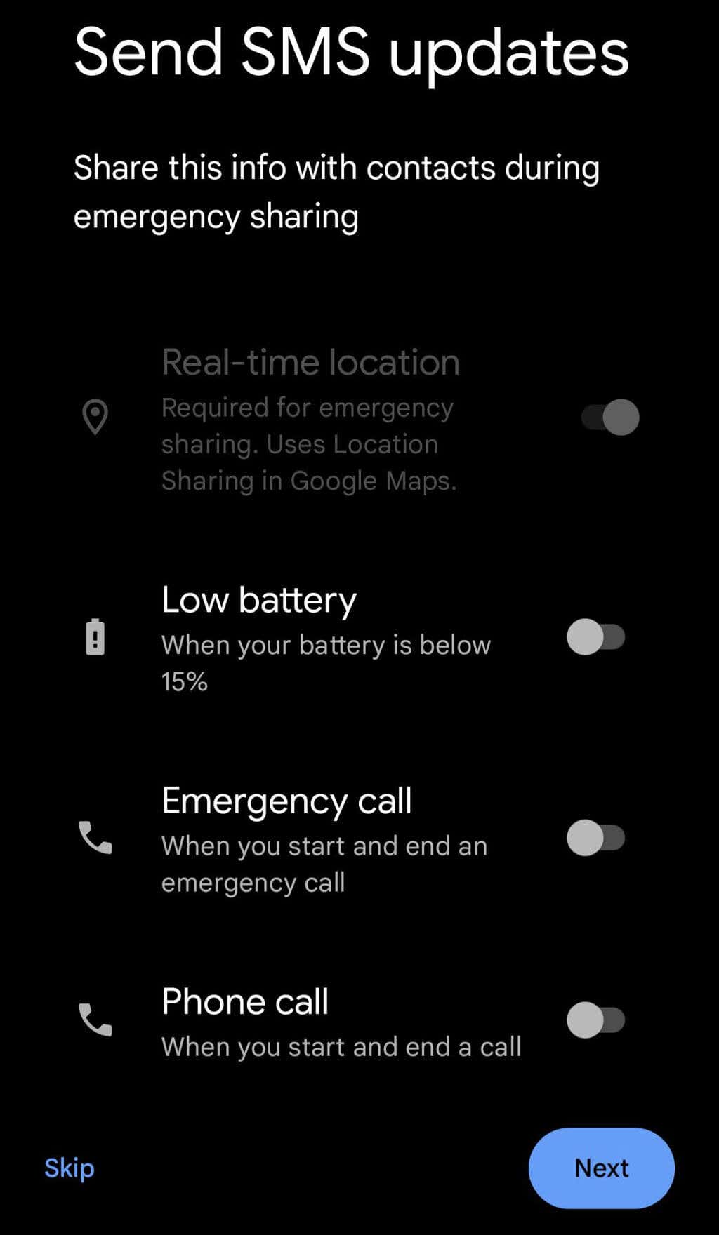 - When emergency sharing is activated, your phone will send SMS updates to your emergency contacts. Select what information will be shared. Real-time location sharing is required for emergency sharing.